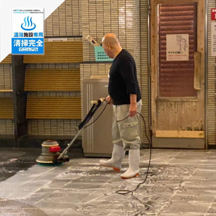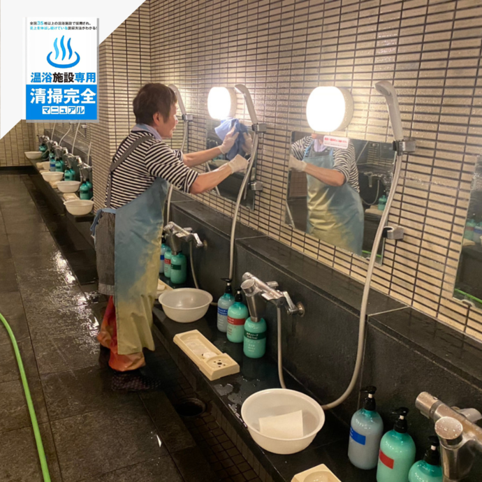 室内に入ると、数人が分担して浴槽周辺や更衣室等の水周りを中心に清掃。優しい会話をしながら、妙技のような手さばきで手順よく作業を進めていきます。おかげで開店前にはキレイに整えられ、お客様をお迎えできる状態で店舗に引き渡し。